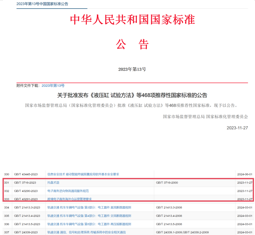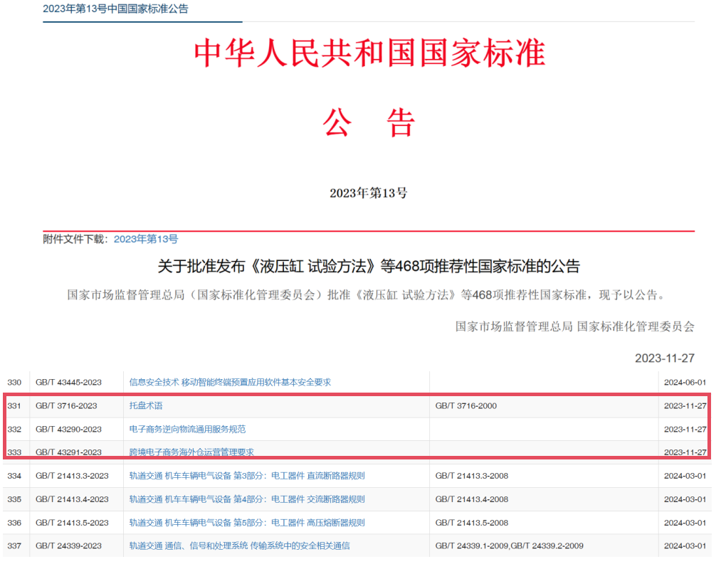 2023年11月27日,国家市场监督管理总局、国家标准化管理委员会发布2023年第9号公告,其中批准发布了由全国物流标准化技术委员会提出并归口的《托盘术语》(GB/T 3716—2023)《电子商务逆向物流通用服务规范》(GB/T 43290—2023)《跨境电子商务海外仓运营管理要求》(GB/T 43291—2023)三项标准。