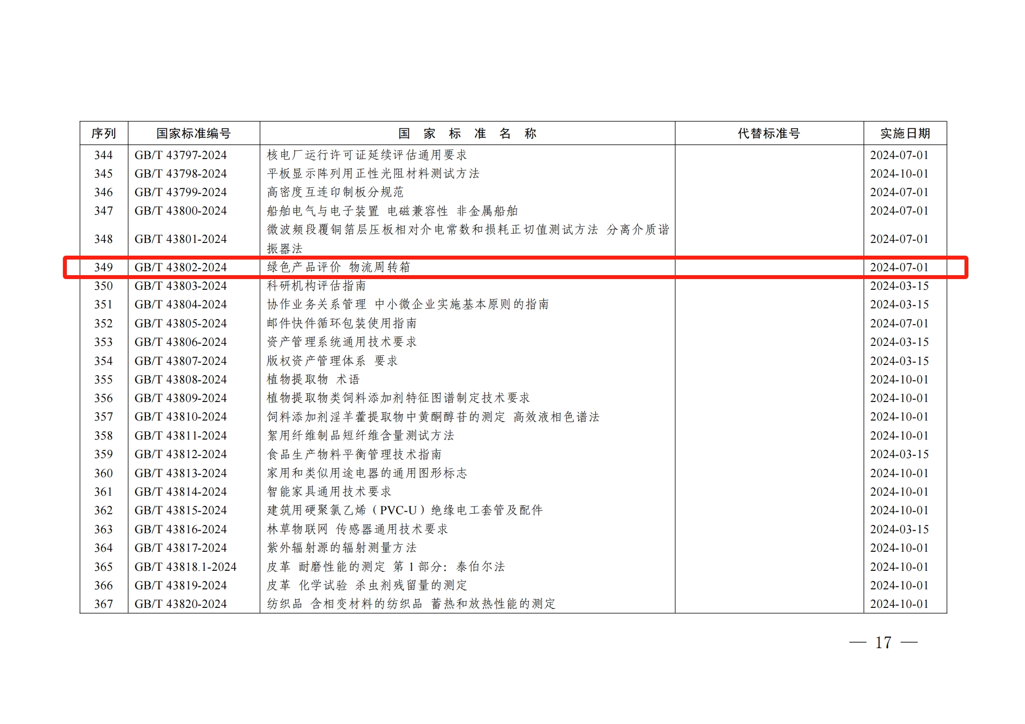 2024年3月15日,国家市场监督管理总局(国家标准化管理委员会)发布2024年第1号公告,批准发布《原木检验》等406项国家标准。其中批准发布了由全国物流标准化技术委员会提出并归口的《绿色产品评价 物流周转箱》(GB/T 43802—2024)这一国家标准,该标准于2024年7月1日正式实施。旨在规范物流周转箱的绿色产品评价工作,推动物流行业的可持续发展。