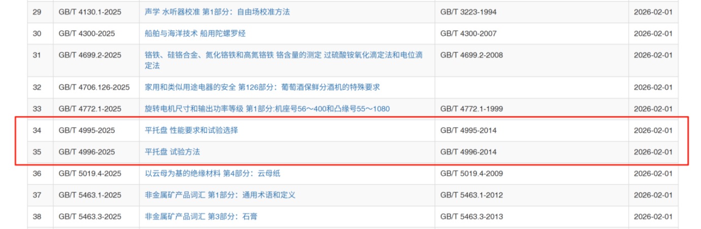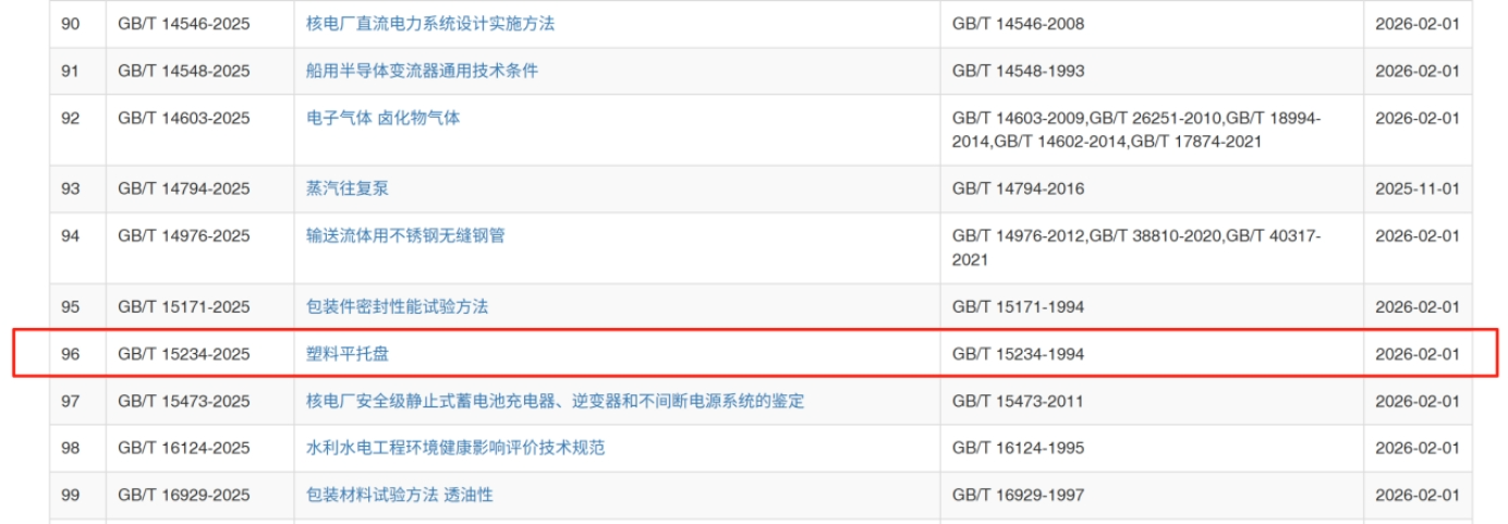 《平托盘 性能要求和试验选择》规定了平托盘的性能要求、试验条件、试验样品数、试验选择、试验载荷、静态刚度试验的持续时间、动态试验的冲击次数和试验报告,适用于平托盘的设计、生产、检验及使用。该标准代替GB/T 4995-2014,将于2026年2月1日起实施。