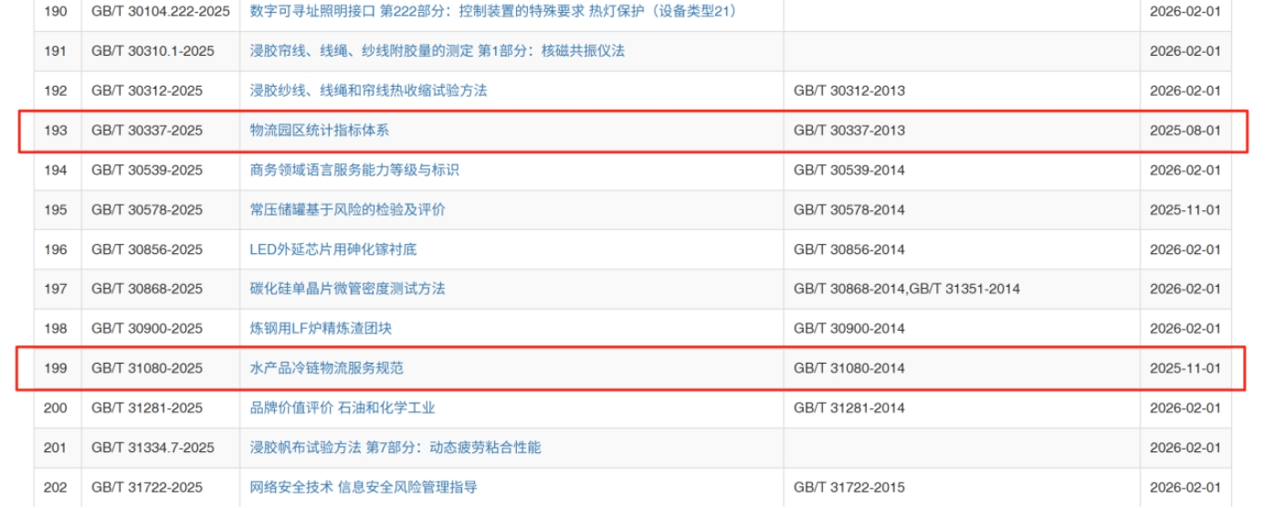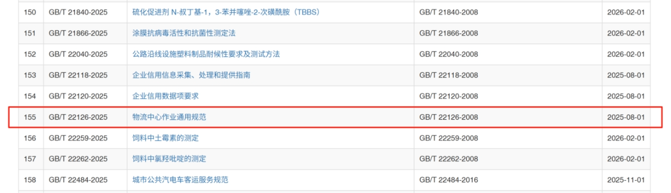 2025年8月1日,国家市场监督管理总局、国家标准化管理委员会批准发布416项推荐性国家标准和3项推荐性国家标准修改单,其中包括由全国物流标准化技术委员会提出并归口的《平托盘 性能要求和试验选择》(GB/T 4995-2025)、《平托盘 试验方法》(GB/T 4996-2025)、《塑料平托盘》(GB/T 15234-2025)、《一次性托盘》(GB/T 20077-2025)、《物流中心作业通用规范》(GB/T 22126-2025)、《物流园区统计指标体系》(GB/T 30337-2025)、《水产品冷链物流服务规范》(GB/T 31080-2025)和《医药产品冷链物流温控设施设备验证 性能确认技术规范》(GB/T 34399-2025)8项国家标准。