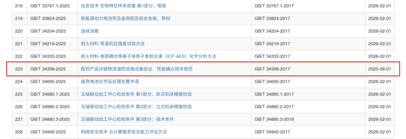 《医药产品冷链物流温控设施设备验证 性能确认技术规范》规定了医药产品冷链物流温控设施设备性能确认的保障要求,温控仓库、温控柜、温控车辆、冷藏箱、保温箱、温度监测系统性能确认的要求,以及证实方法,适用于医药产品冷链物流温控设施设备验证过程中涉及的温控仓库、温控柜、温控车辆、冷藏箱、保温箱及温度监测系统的性能确认等活动。该标准代替GB/T 34399-2017,将于2025年8月1日起实施。