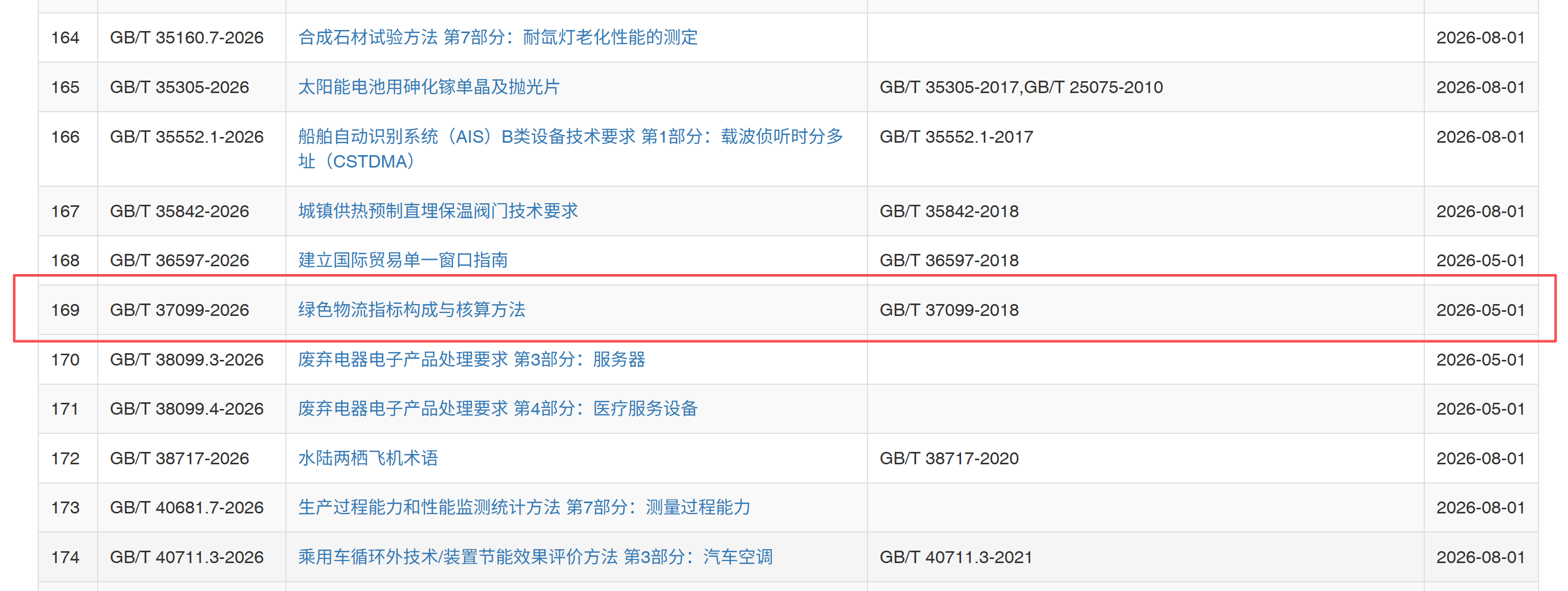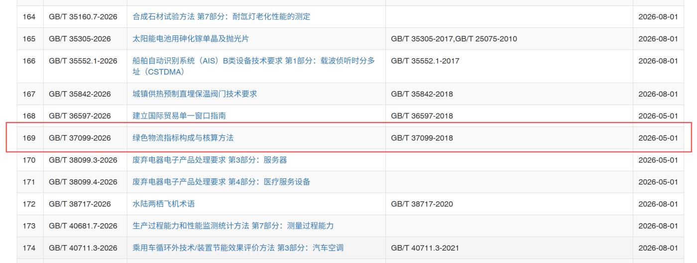 2026年1月28日,国家市场监督管理总局、国家标准化管理委员会发布2026年第4号《热交换器》等354项推荐性国家标准和7项推荐性国家标准修改单的公告,其中包括由全国物流标准化技术委员会提出并归口的《绿色物流指标构成与核算方法》(GB/T 37099—2026)国家标准。