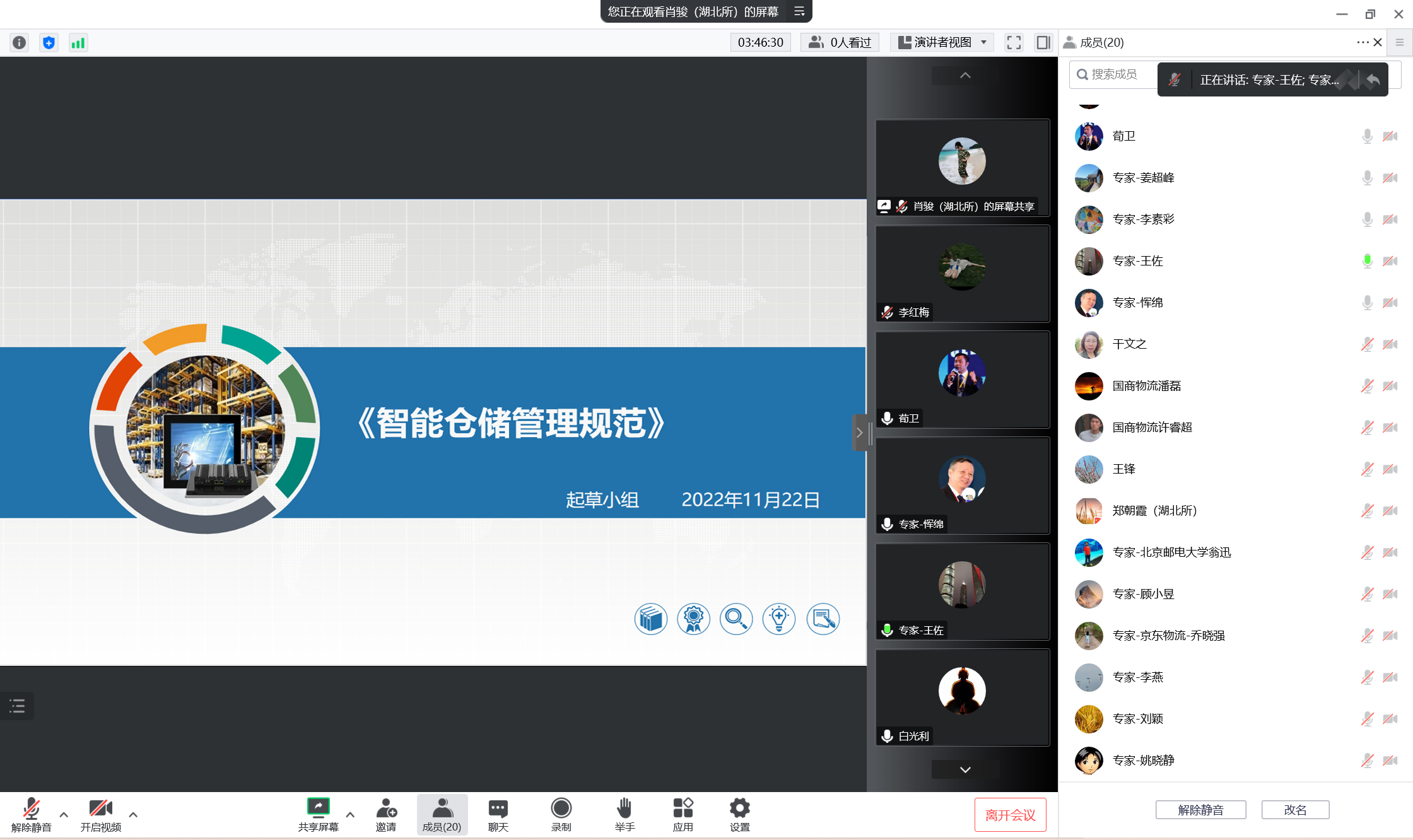 2022年11月22日下午,由全国物流标准化技术委员会组织的《智能仓储管理规范》行业标准(项目编号:303-2020-003)审查会通过线上的方式召开。