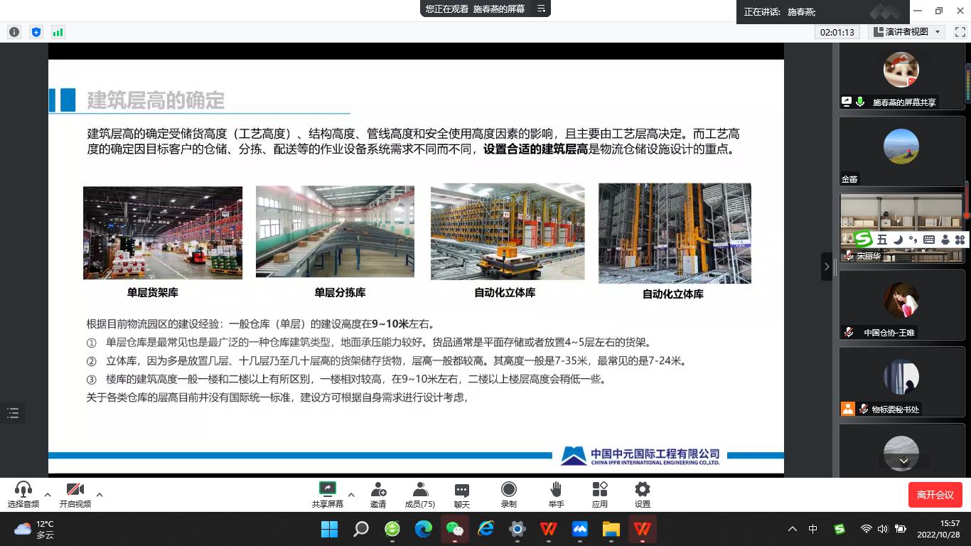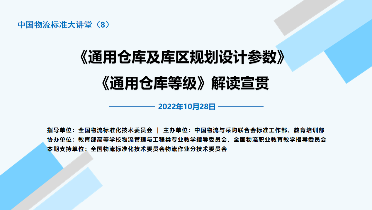 2022年10月28日下午,中国物流标准大讲堂第8期活动对《通用仓库及库区规划设计参数》(GB/T 28581-2021)、《通用仓库等级》(GB/T 21072-2021)两项国家标准进行了宣贯,共计1000余人通过在线直播平台参加了活动。