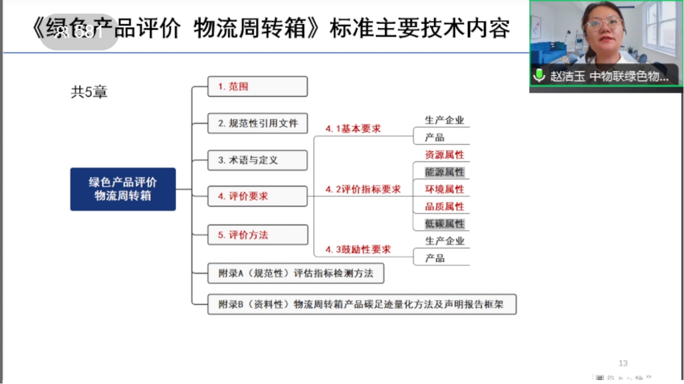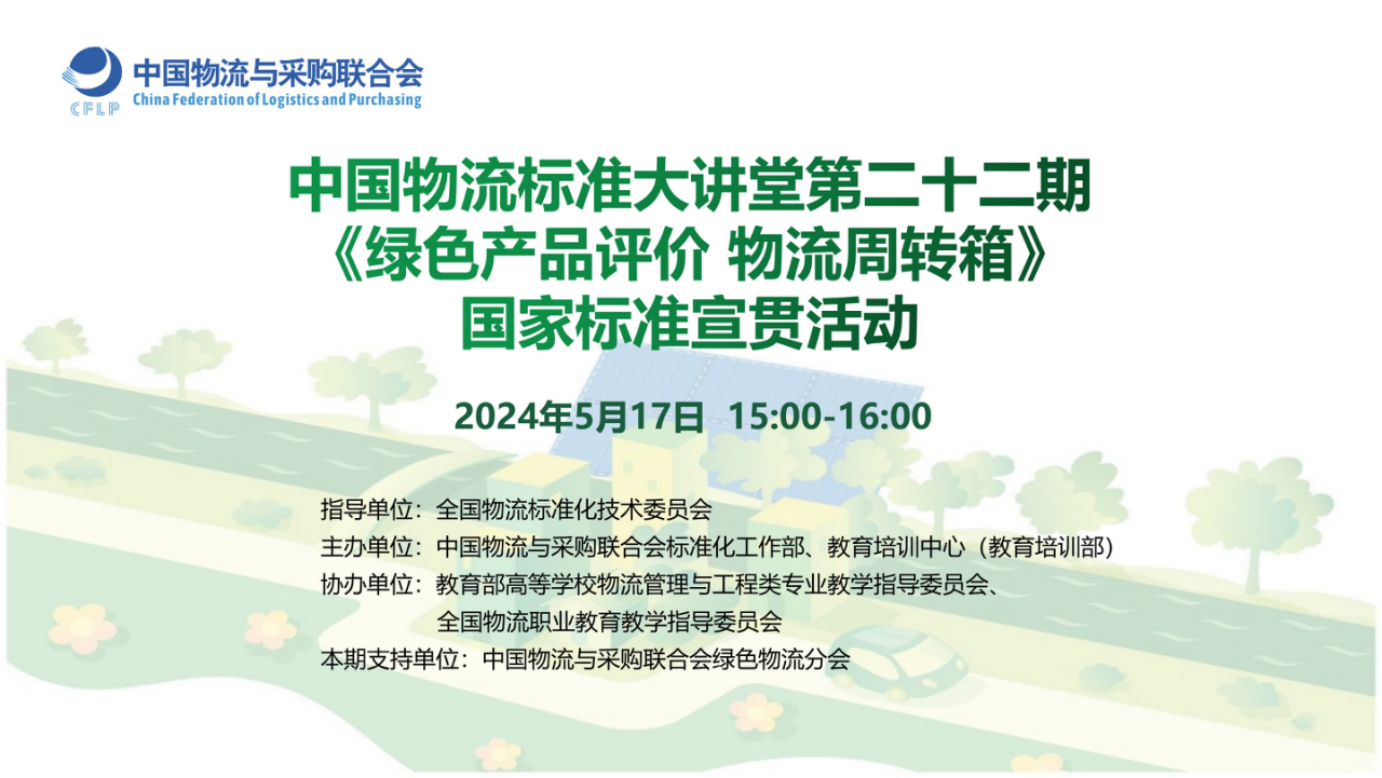 2024年5月17日,“中国物流标准大讲堂22期:《绿色产品评价 物流周转箱》标准宣贯”通过线上方式成功举办,2000余人参加了宣贯活动。