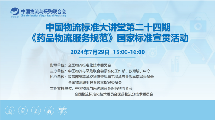 2024年7月29日下午,中国物流标准大讲堂第24期《药品物流服务规范》标准宣贯活动以线上直播形式举办。物流从业人员、物流专业院校师生1800余人次通过小鹅通“中物联教育培训”直播间、微信“中物联教育培训”“中物联医药物流分会”视频号三个平台参加了宣贯活动。