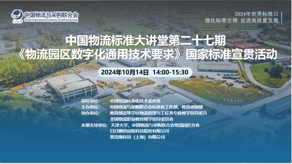 2024年10月14日是第55届世界标准日。经向国家标准委报备,全国物标委举办“2024年世界标准日——‘中国物流标准大讲堂’活动”,对《物流园区数字化通用技术要求》(GB/T 44459-2024)进行了宣贯。2100余名行业企业代表、专家、院校学生参加了本次宣贯活动。