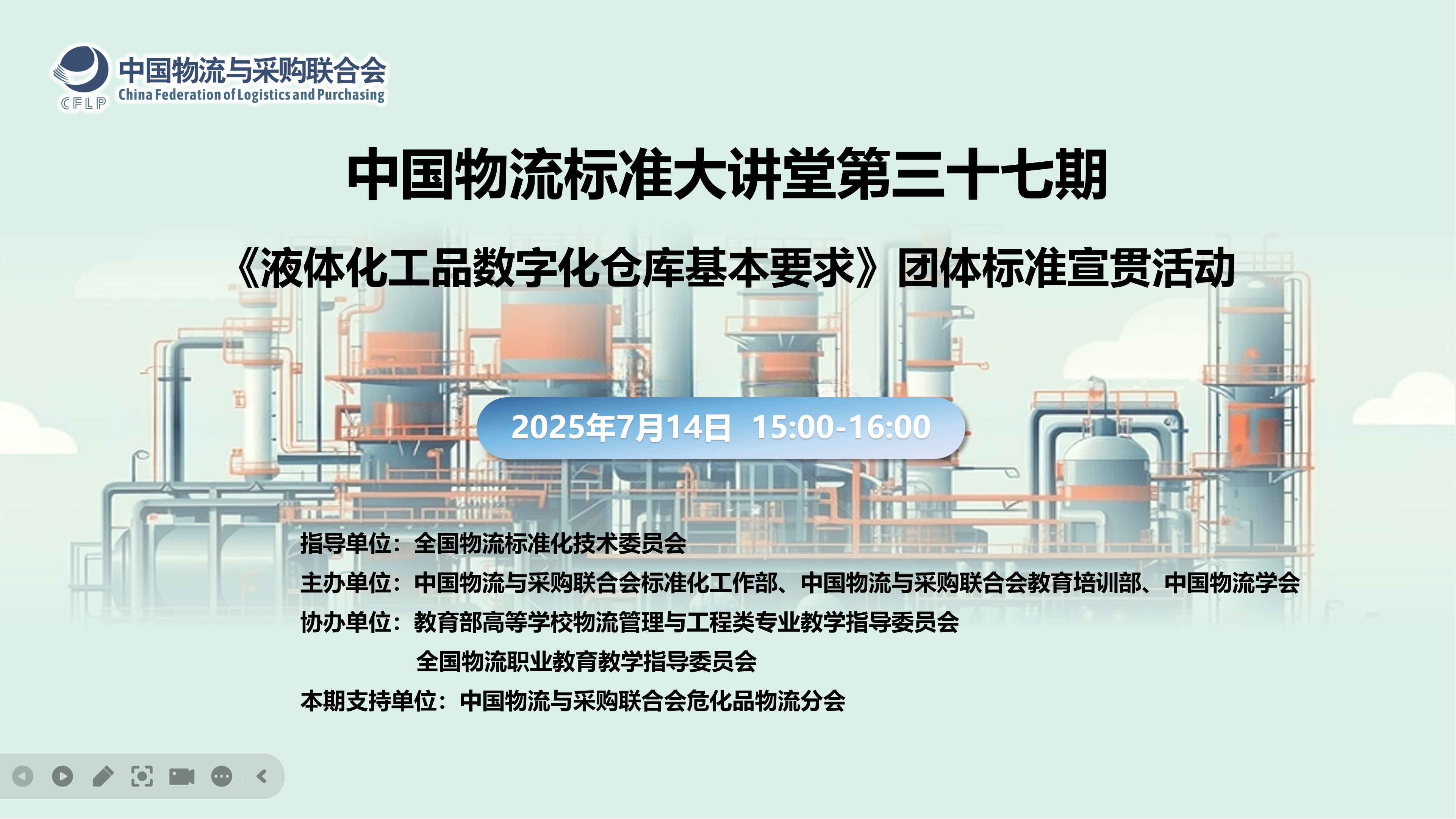 2025年7月14日,在全国物流标准化技术委员会的指导下,taptap免费版苹果标准化工作部、教育培训部和taptap怎么下载软件主办的中国物流标准大讲堂第37期活动对物流团体标准《液体化工品数字化仓库基本要求》(T/CFLP 0080-2025)进行了宣贯,2500余人线上参加了宣贯活动。