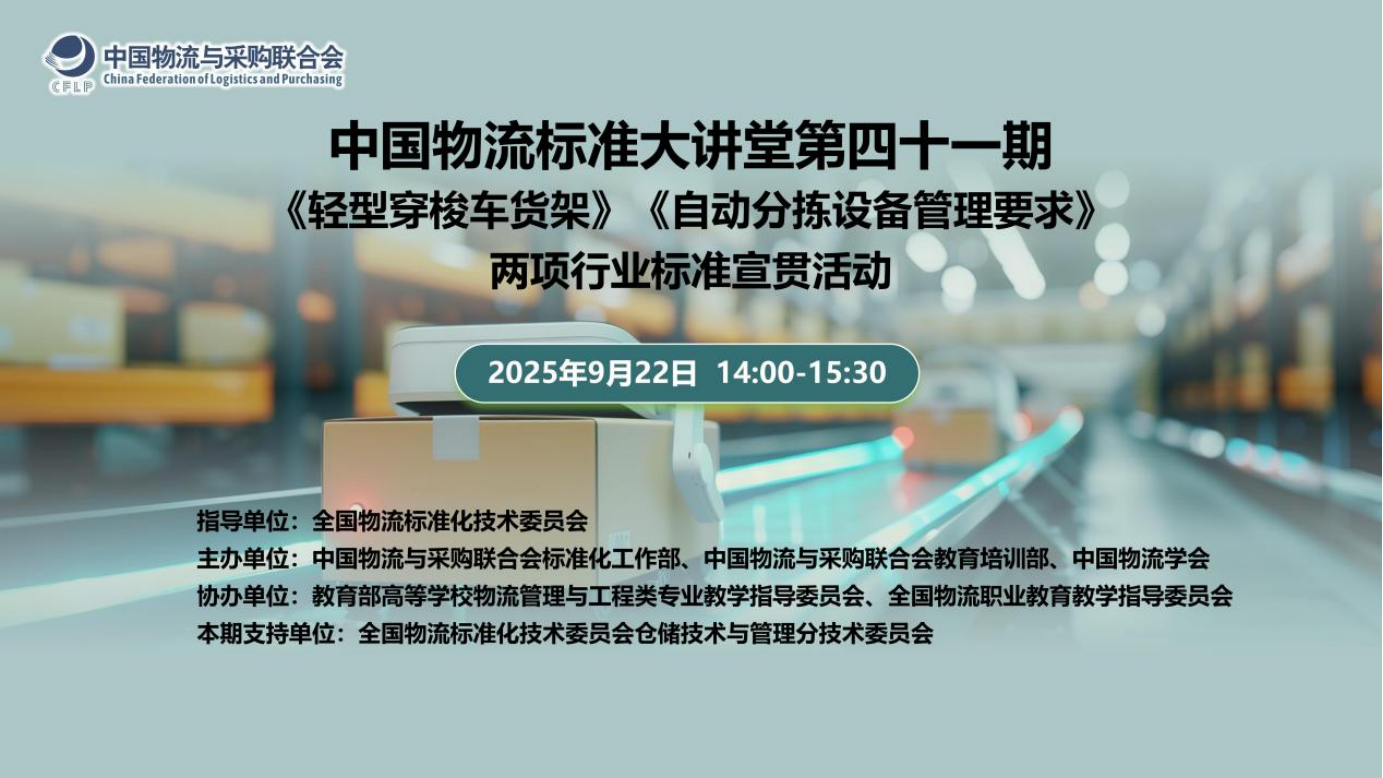 2025年9月22日,全国物流标准化技术委员会组织开展了“中国物流标准大讲堂”第41期活动,对物流行业标准《轻型穿梭式货架》(WB/T 1137-2023)、《自动分拣设备管理要求》(WB/T 1041-2024)进行宣贯,1600余人在线参加了活动。
