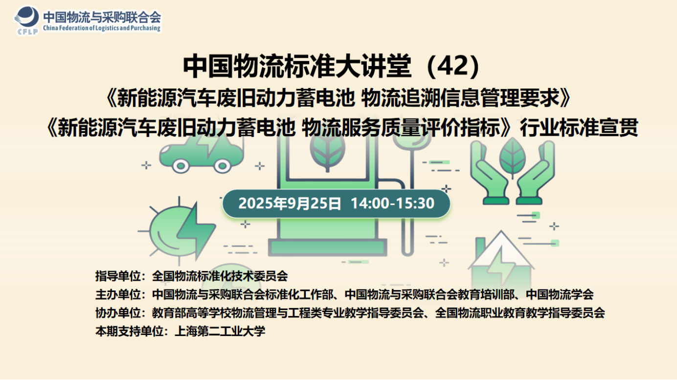 2025年9月25日,“中国物流标准大讲堂”第42期活动对《新能源汽车废旧动力蓄电池 物流追溯信息管理要求》(WB/T 1136-2023)、《新能源汽车废旧动力蓄电池 物流服务质量评价指标》(WB/T 1140-2024)两项物流行业标准进行宣贯,2880余人在线参加了活动。