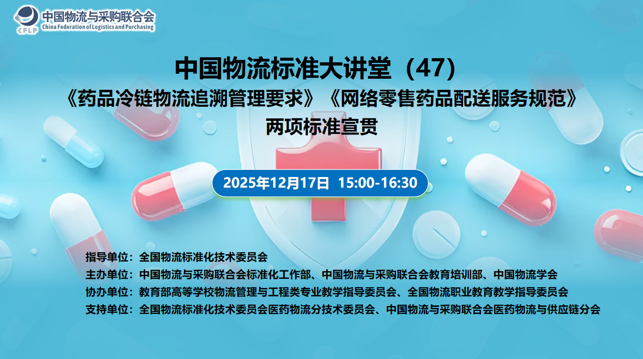 2025年12月17日,在全国物流标准化技术委员会的指导下,中国物流与采购联合会标准化工作部和教育培训部、中国物流学会共同主办了“中国物流标准大讲堂”第47期活动,对《药品冷链物流追溯管理要求》(GB/T 46204-2025)和《网络零售药品配送服务规范》(WB/T 1146-2024)两项标准进行宣贯。本次活动共有2200余人次在线参加。