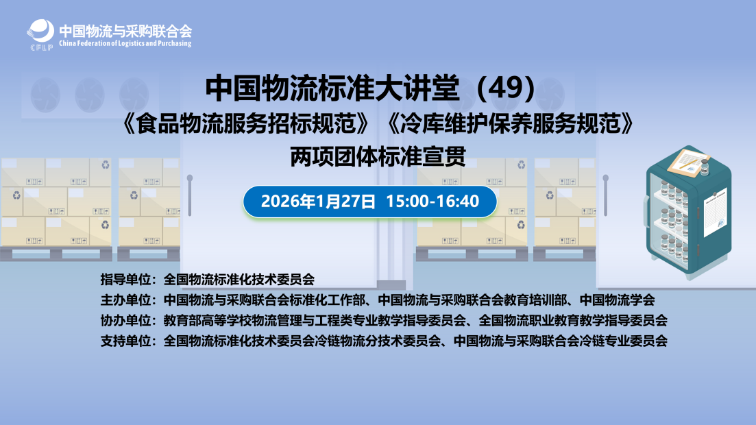 2026年1月27日,在全国物流标准化技术委员会的指导下,中国物流与采购联合会标准化工作部和教育培训部、中国物流学会共同主办了“中国物流标准大讲堂”第49期——《食品物流服务招标规范》(T/CFLP 0083—2025)、《冷库维护保养服务规范》(T/CFLP 0084—2025)团体标准宣贯活动。本次活动吸引2800余人次在线参加。