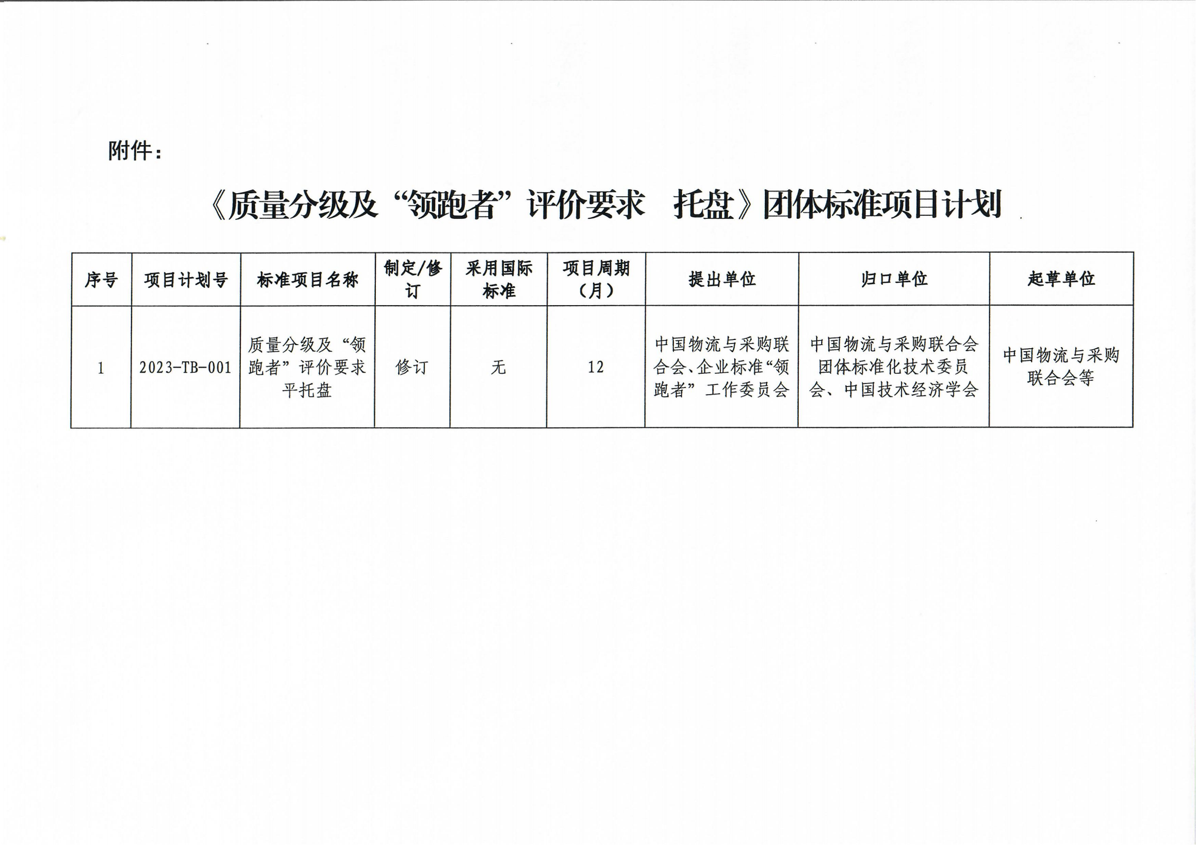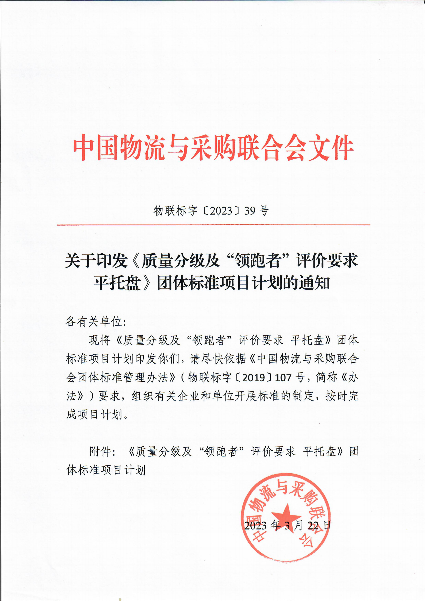 关于印发《质量分级及“领跑者”评价要求 平托盘》团体标准项目计划的通知