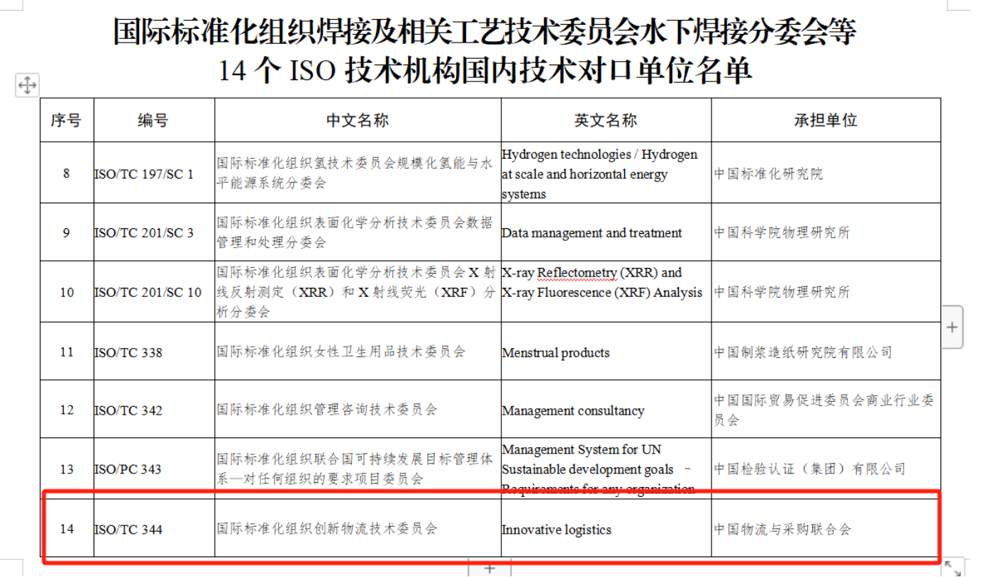 ISO/TC 344(创新物流技术委员会)是2023年6月由国际标准化组织(ISO)正式批准设立的国际标准化技术机构,是由中国承担的首个物流领域的国际标准化技术委员会。新成立的ISO/TC 344的秘书处工作和国内技术对口工作均由中物联承担,将对今后物流国际标准化工作的顺利开展,实现国内国际标准的协调一致,推进中国标准“走出去”和国际标准及时转化,实现我国物流业与国际接轨具有重要意义。